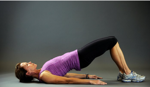 Lie on your back with your arms on the floor at your sides, your legs bent at the knees and your feet flat on the floor. Tighten your abdomen and glutes and slowly lift your hips off the floor, while keeping your back straight. Then, slowly lower your butt and hips back down to the floor. Do 10 repetitions.