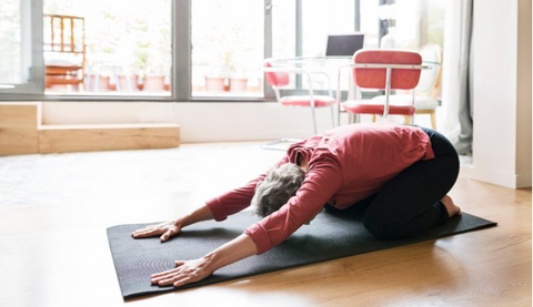 While you’re still on your hands and knees, push your butt back onto your heels, with your knees apart. Lower your upper body between your knees, stretch your arms along the floor above your head and place your forehead on or near the floor. Hold this position for 20 to 30 seconds.