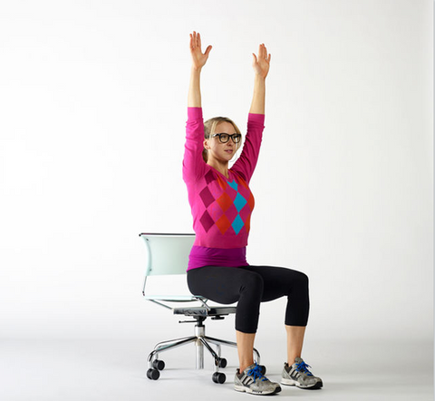 This exercise focuses on strengthening the core and upper body, while also improving posture. To do this exercise, start sitting up straight in your office chair. Place your hands behind your neck and then extend your arms above your head. Simultaneously lift your legs to a 90 degree angle against the seat of your chair and hold for a few seconds. This will activate your core and stretching yourback, chest and shoulders.