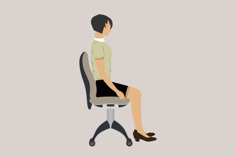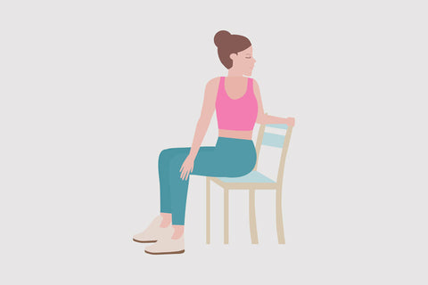 To do this exercise, start by sitting up straight with your feet flat on the floor. Place your right hand on your left knee and your left hand on the back of your chair. Then, twist to the left as far a you can while keeping your back straight. Hold this position for five seconds, and then repeat on the opposite side.