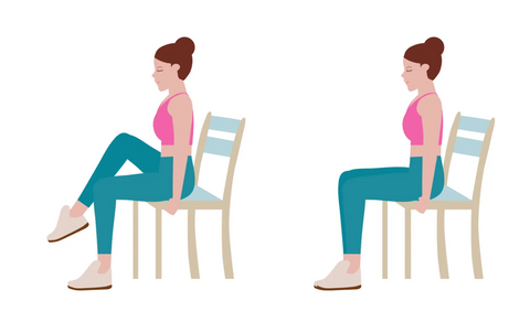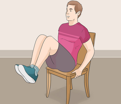 This exercise focuses on strengthening the hamstrings and hip flexors.To do this exercise, start by sitting with your feet flat on the floor and arms relaxed by your side. Then, lift your right leg as high as you can while keeping yourback straight and supporting your body with your arms. Hold this position for five seconds and then switch sides.